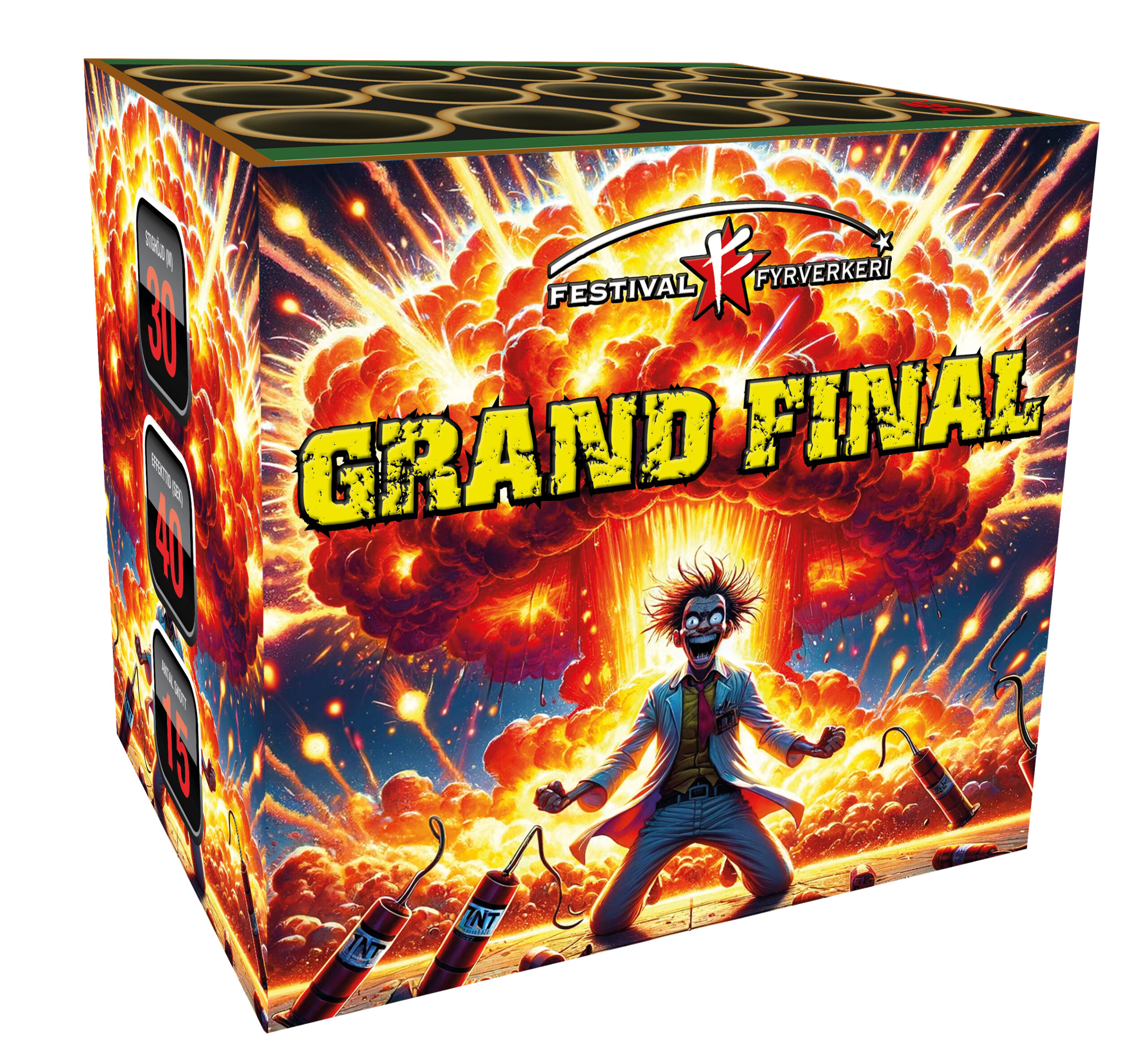 Grand Final är en bombtårta med tydliga, stora brott och en kraftfull avslutning. Effekterna byggs upp i ett lugnt tempo mot en markant final, vilket gör den väl lämpad som avslutning på ett fyrverkeri. Med en stighöjd på 40 meter och en effekttid på 40 sekunder ger den en stabil och tydlig visuell upplevelse.