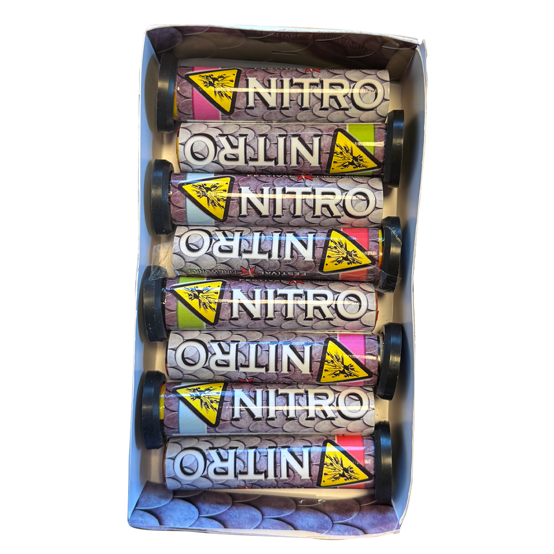 Nitro 8-pack, även kända som Shottubes, är en modern klassiker som erbjuder kraftfulla effektbomber i rött och grönt med rejält knall. Detta innehåller 8 st kraftiga 18 mm bomber som stiger 25 meter. Ett roligt fyrverkeripack för att höja stämningen under nyår